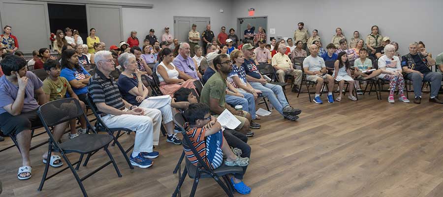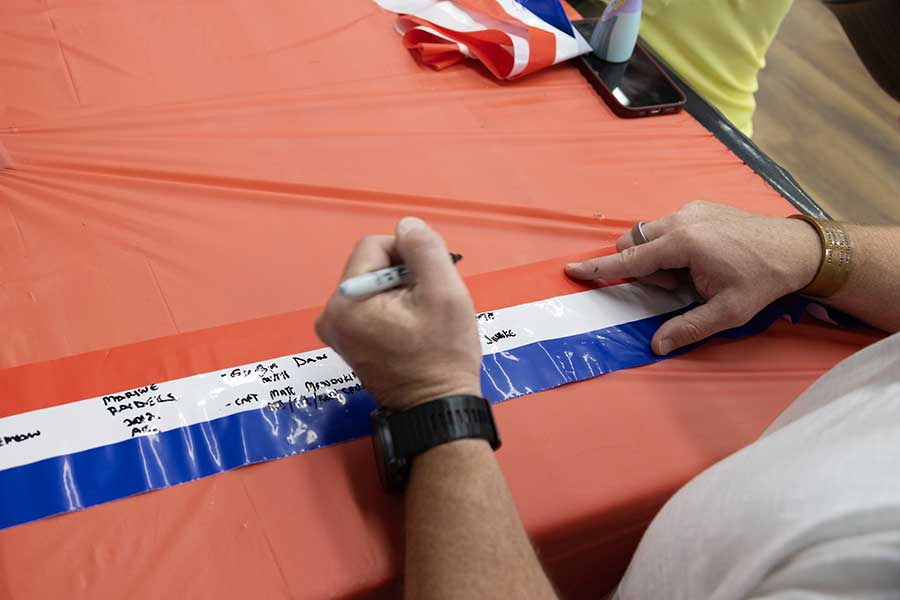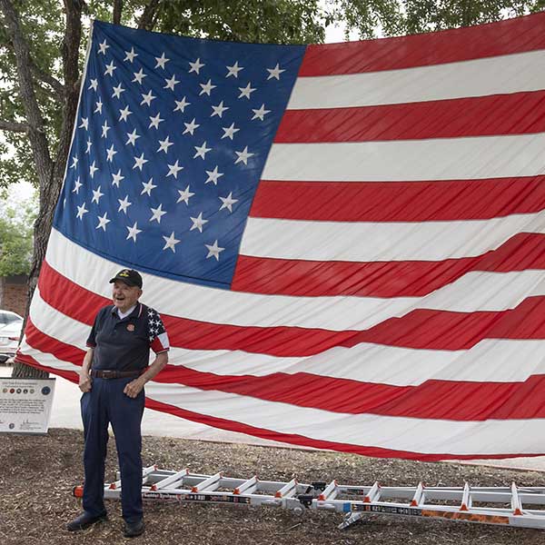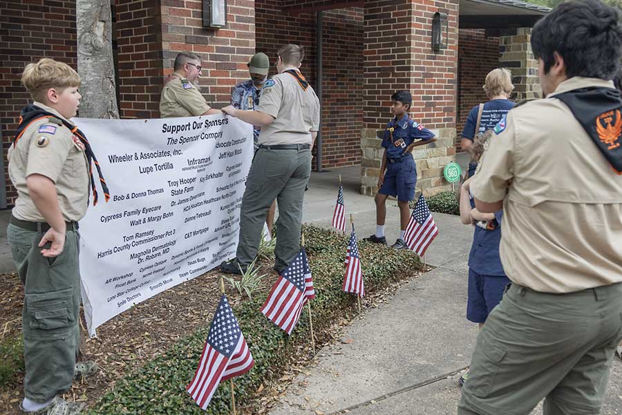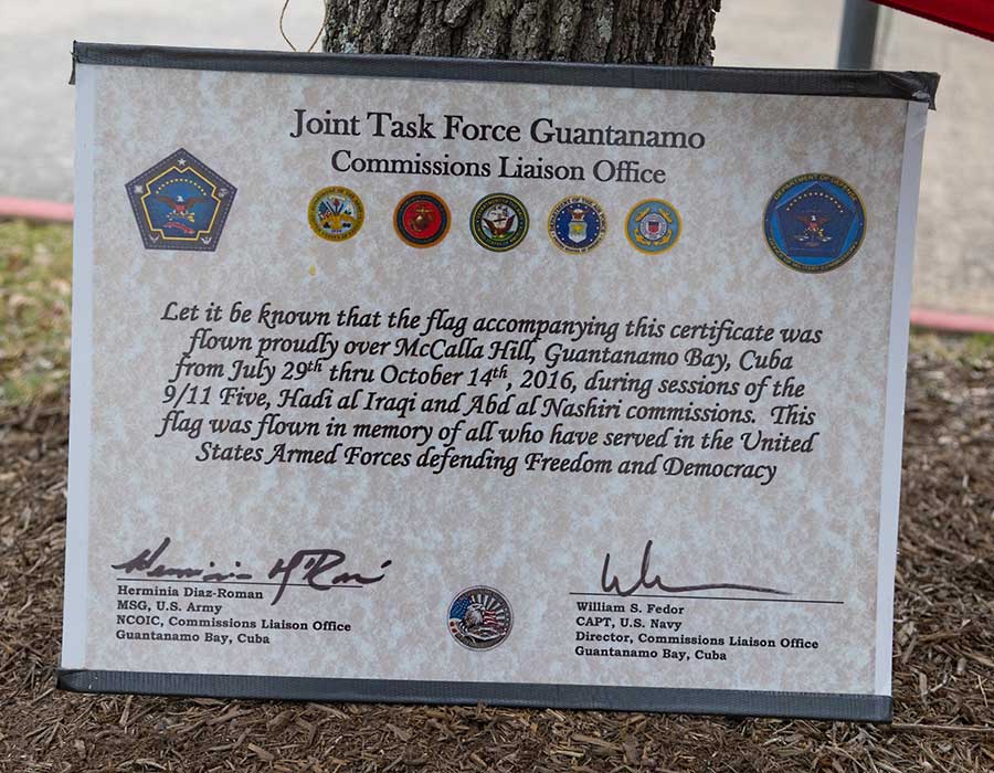 On Memorial Day, The Bridgeland Community Supports Veterans, Inc. (TBCSVI) held its annual remembrance ceremony at the Lakeland Activity Center to honor the men and women of the United States Armed Forces who gave their lives in service to our country. A flag flown over McCalla Hill in Guantánamo Bay, Cuba, from July 29 through October 14, 2016, was displayed in memory of all who have served in defense of freedom and democracy. Emilio Rodriguez led the ceremony, with prayers, remembrance, and a moving performance of Taps played by Mike McCurry. Ribbons bearing the names of fallen loved ones were tied around trees in the park as a visual tribute.
